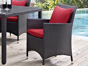 Powder-coated aluminum frame woven with water and UV-resistant synthetic rattan.